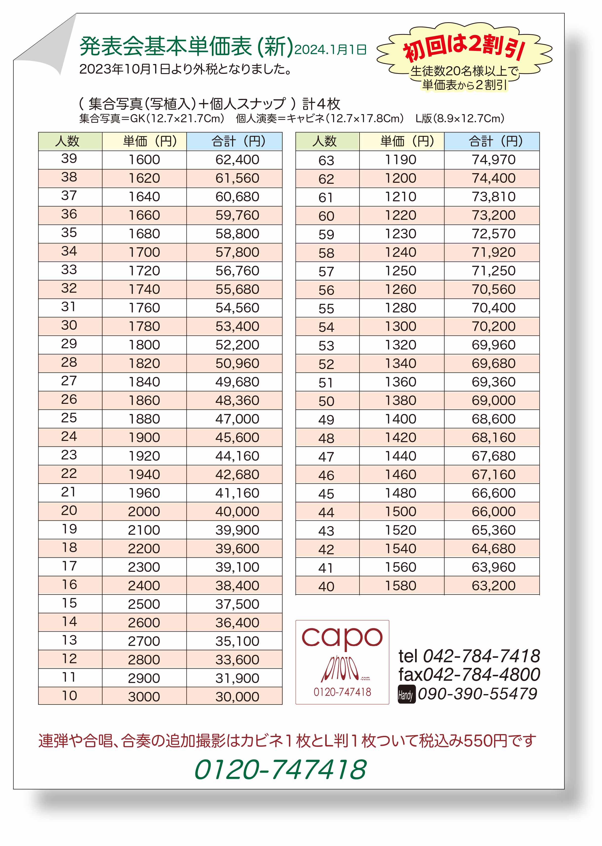 集合写真のみや個人写真のみの場合もご相談ください。 当日の欠席者・追参加の方が居た場合も単価表が原則です、ご安心ください |