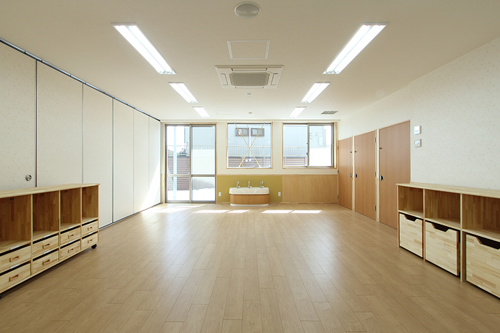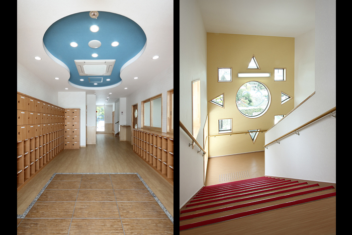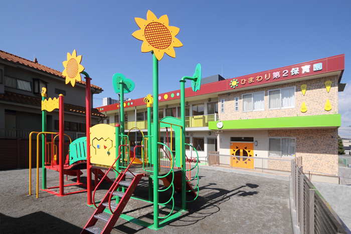 工事の関係で撮影は2回に及びました。1回目は雪が残るコンデションのなかで、室内を撮影。パーティーションを入れたり出したりと、助手さんと連携プレーで進めていきました。外観はお天気の良い日を選び今度は現場監督様と連携プレー。道具や資材を移動させながらの撮影でした。ひまわりの遊具が写っているカットは、アルバムの1ページ目に配置しました。黒表紙金文字アルバムは正式な納品に使用されます。対してポップな略式アルバムも多いにご利用いただいています。