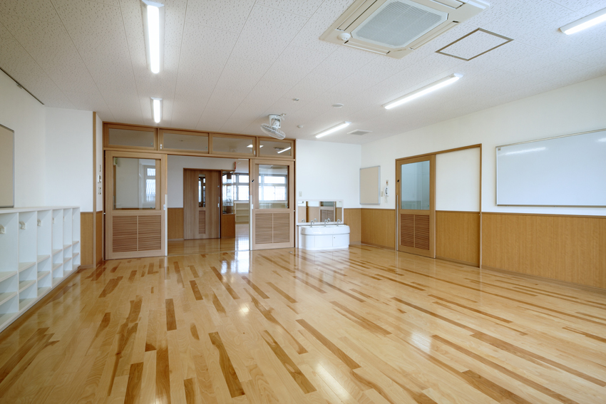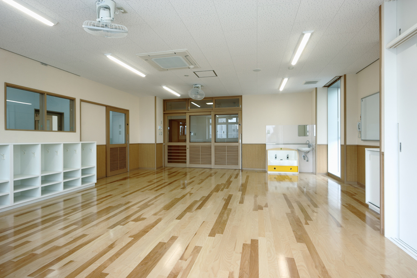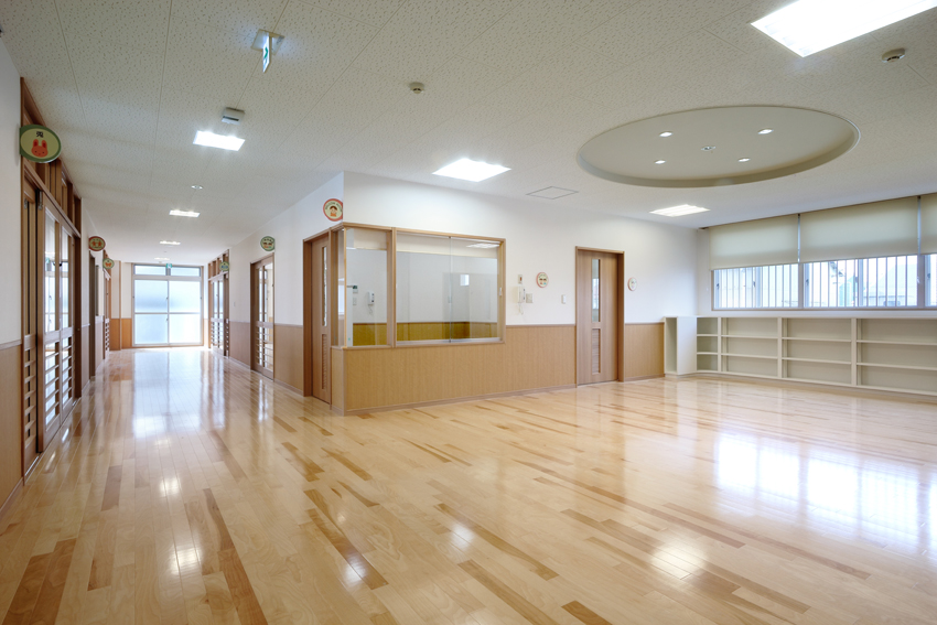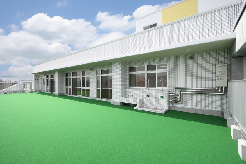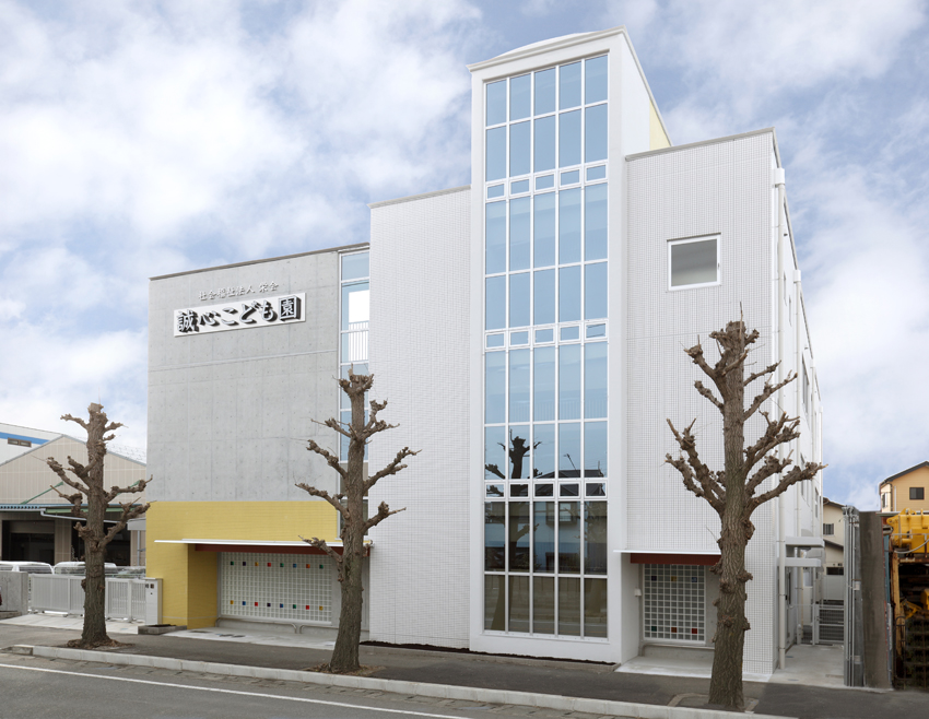 市街に建設された保育園。デザインが成された瀟洒な建物です。撮影当日は朝から生憎の曇り空。しかし行いが良いのかご覧の通り晴れ間に恵まれました。k とはいえ撮影予定の外観は北東から北向きなので空は白く飛んでしまいます。空の合成と十数本の電線の消去作業で後処理は楽ではありませんでした。