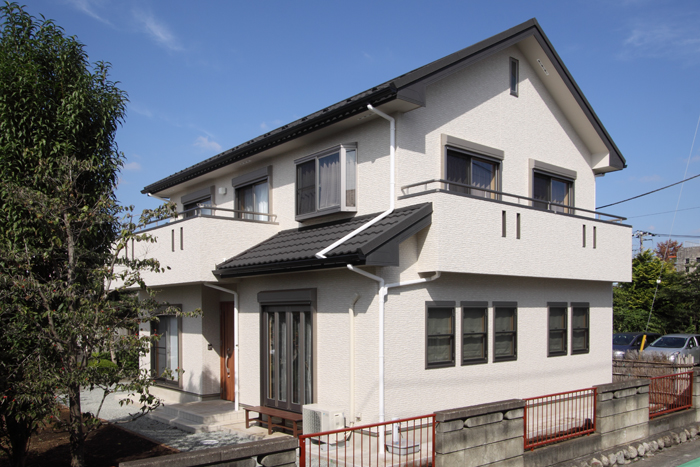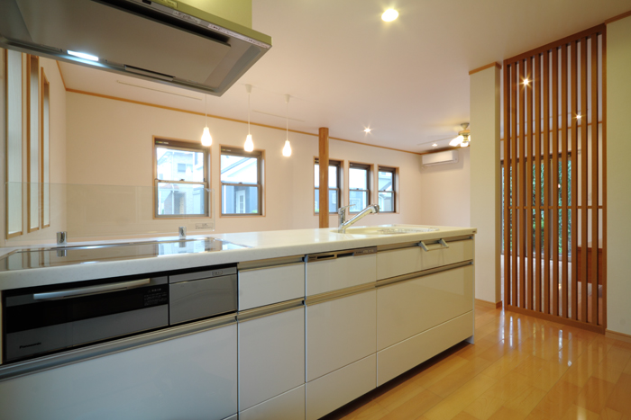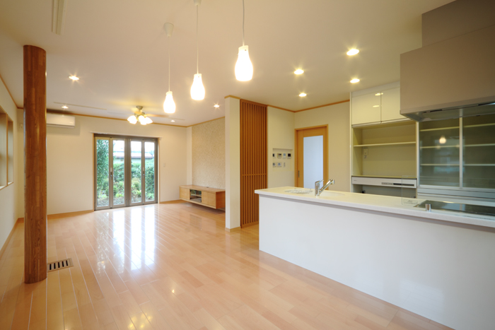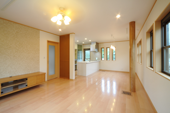 一階のLDKがとても広く、フロアーや柱に高級感があります。15カット撮影していますが、LDKだけで4カット撮影しています。外観は網戸の方向をそろえ(どの現場でもそのようにしています)時間帯を考慮して撮影しています。砂利がきれいに敷いてあるのと、庭木とのバランスを考慮してアングルを決めました。